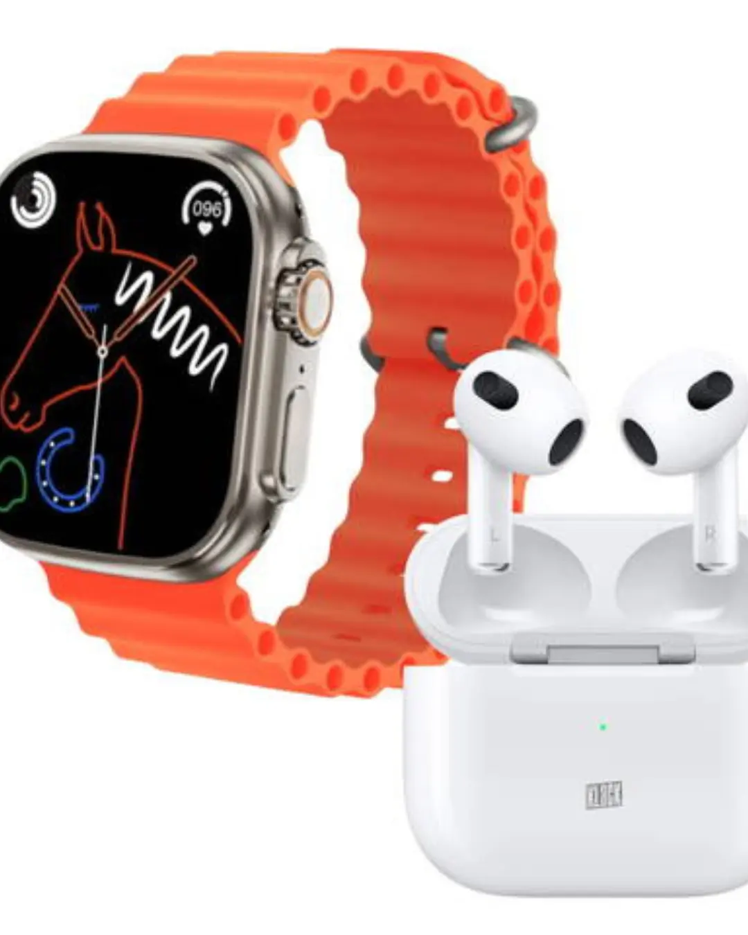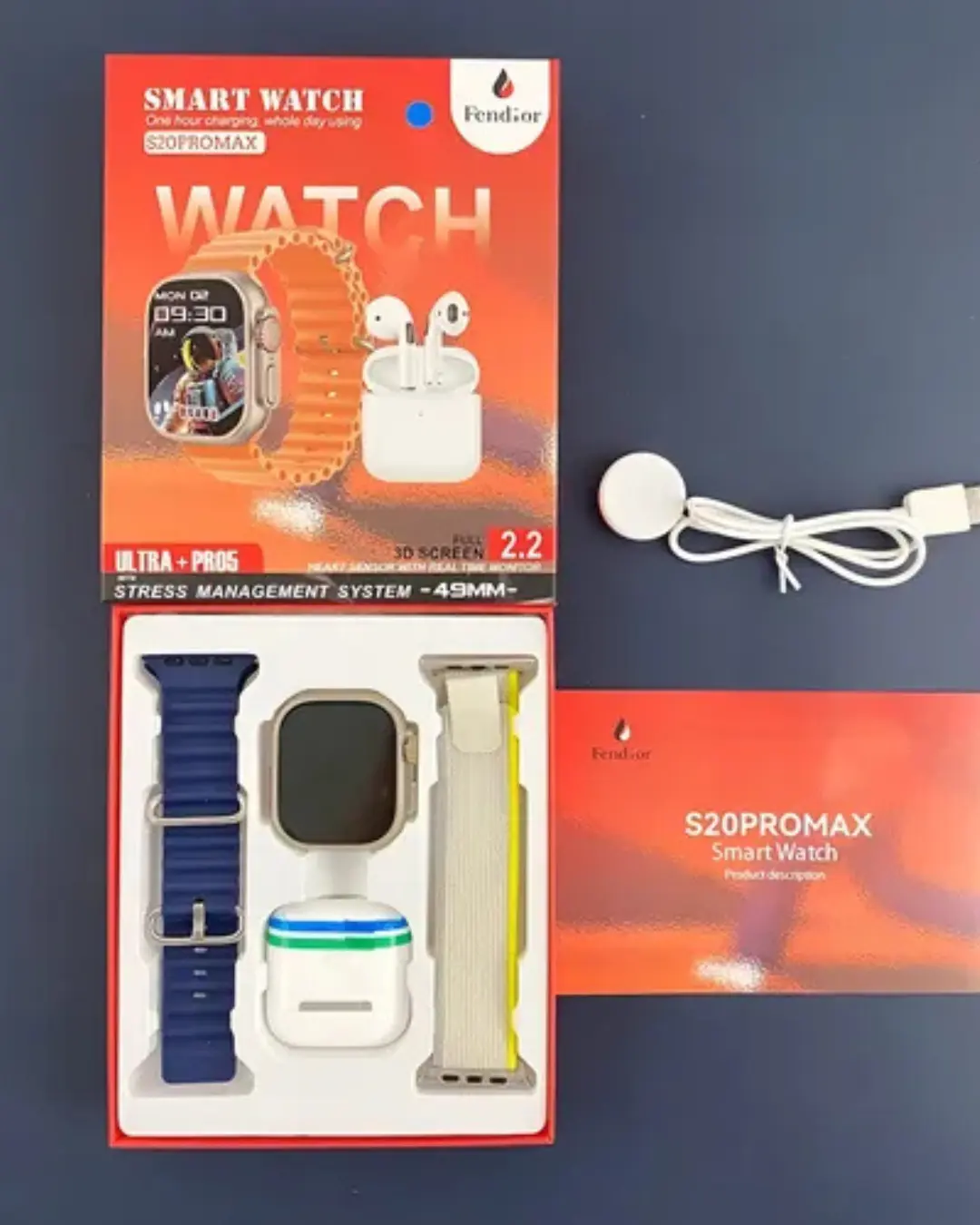 Incluye el Smartwatch S20 Pro Max de 49mm, con funciones de salud y llamadas, auriculares inalámbricos TWS y dos mallas intercambiables para combinar con tu estilo. Ideal para quienes quieren tener todo al alcance de la muñeca y los oídos sin complicaciones.