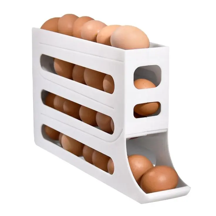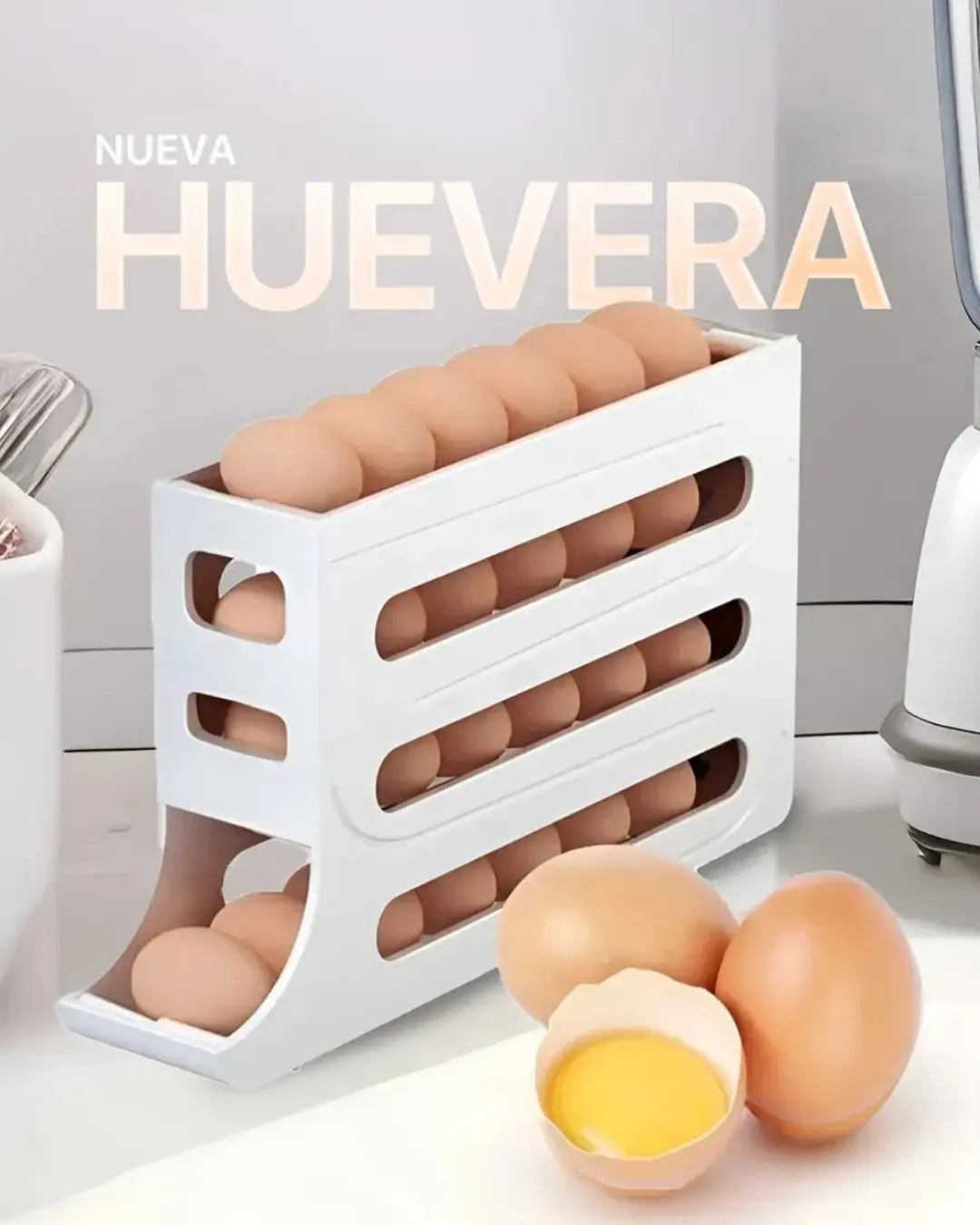 Su diseño inclinado permite que los huevos rueden automáticamente hacia adelante gracias a su sistema por gravedad, dispensando uno a la vez, sin atascos ni caídas.